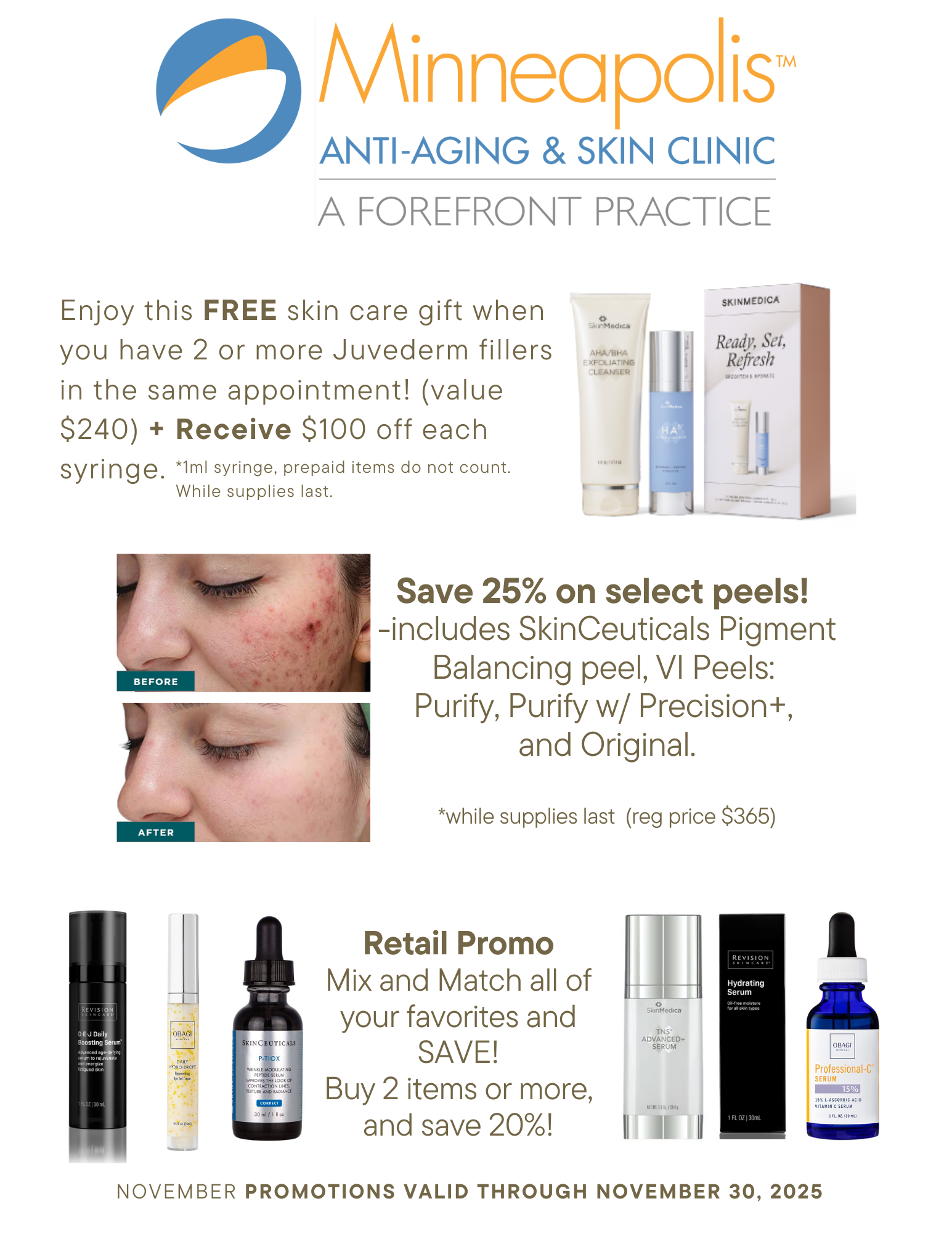 We offer some of the most innovative, effective, and trusted procedures on the market today--and we're always introducing new and novel techniques when we think they can truly help patients. Find out what's happening and what procedures are trending right now! Promotions at Minneapolis Anti-Aging and Skin Clinic now rotate monthly, so hurry in if you see something you like!